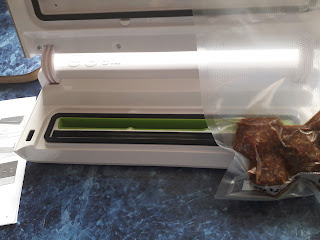 One of the best ways to keep macadamias from going rancid is to put them in a vacuum packed bag and then into a chiller. To this end I bought a small machine in one of Briscoe's many sales that would do this job. I decided I would like to vacuum pack some bread to put in the freezer. There are two buttons - one for vacuum and one for seal. I was a bit panicked when I did the first load, and it will be very interesting to see if the slices will resurrect when I open them. I did get progressively better.